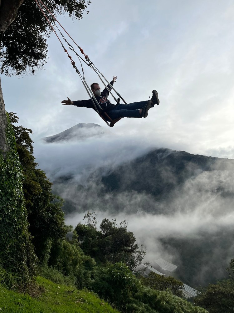 The city of Banos is situated in a large valley surrounded by mountains on all sides. The bus to La Casa Del Arbol had open sides, party speakers, and a pole in the back! Perhaps not the safest thing to be trekking up the sides of a valley, but that didn’t stop us from taking full advantage of the experience! When we reached our destination, we hiked about a 1/2 mile up to the famous Swing At The End Of The World. This mountaintop was not always a bustling tourist attraction, but used to have just one swing. A single photo captured from that swing of the erupting volcano in the distance made National Geographic headlines and helped spurn this phenomenal view into a viral IG sensation!