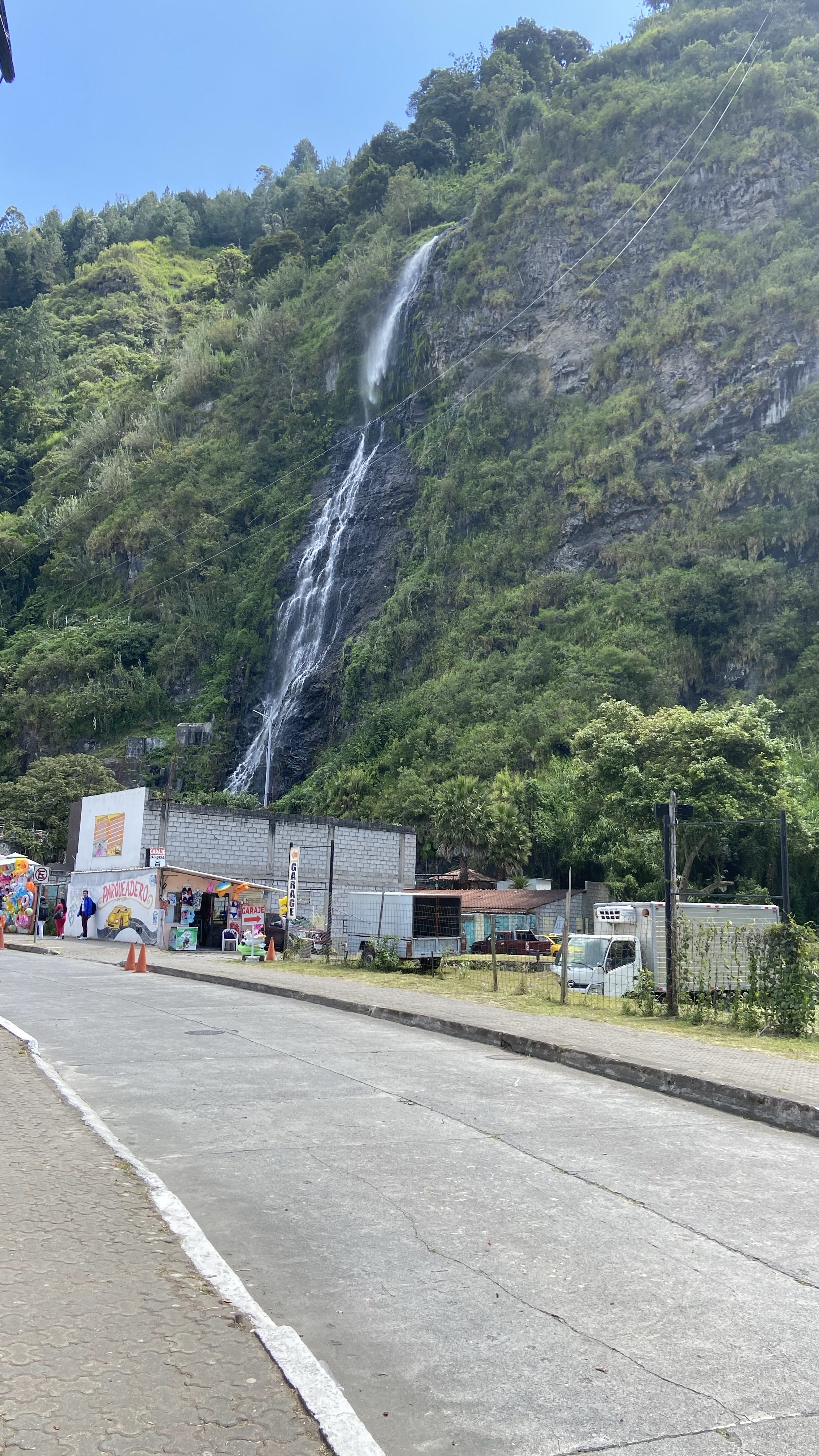 With 3 hours to spend before the bus would take us back to Quito, I wandered towards the downtown streets of Banos to do a little last minute souvenir shopping and exploration. Walking around, I saw some cool graffiti and patterned sidewalks on my way to get some ice cream from the highly recommended Tutto Freddo! After finishing my refreshing snack, I noticed a waterfall tucked in the back of the city along one of the cliffs rising up from the valley and decided to check it out! While not as massive as the other roaring falls we encountered during the trip, it was a welcome sight within the city!