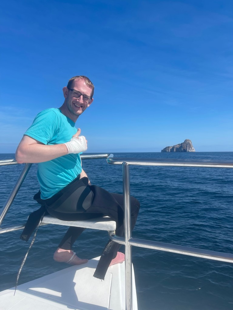 The catamaran came back around and we hopped on board after a wonderfully successful snorkeling adventure! Heading out to the beach back by San Cristobal island, we shed our wetsuits and gorged ourselves on the provided lunch to refuel. The other group that split off earlier that morning would have their time experiencing Kicker Rock! The ride to the beach didn’t seem to take too long and we hopped on motor rafts to bring us the rest of the way in so our boat didn’t run aground too close to shore.