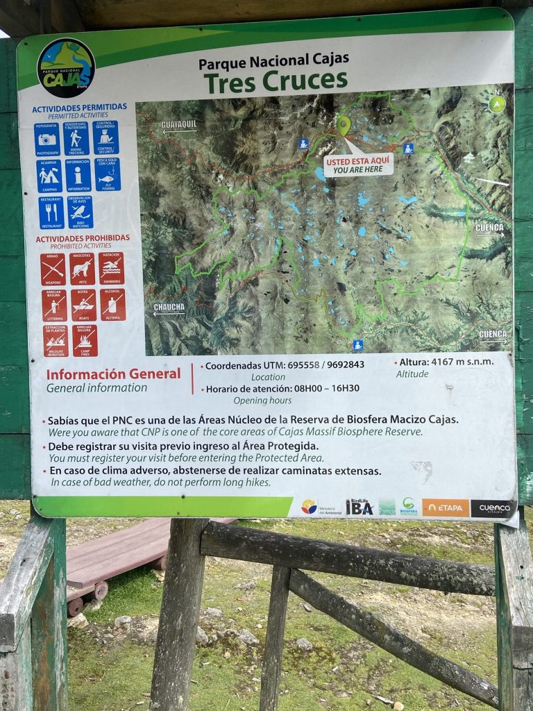 From the visitor center, we would make our way north towards Lake Toreadora, one of the jewels of Cajas sitting at 13,000ft! For all that I had heard about altitude sickness and hiking around in the thinner air, I didn’t really notice much difference from my usual hikes back home. Perhaps having spent the past few days chilling in Cuenca at 8,000ft was enough to acclimate me. We began our 3mi expedition from the trailhead map posted nearby.