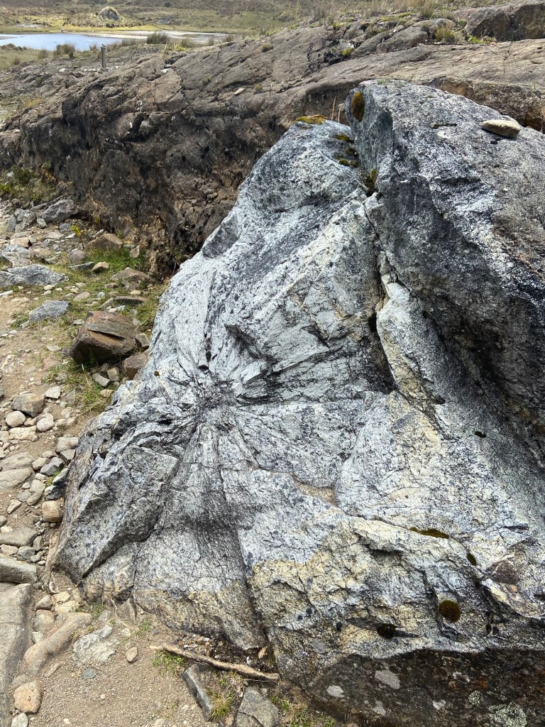 As we approached the lake, the trail turned from a rocky path to a wet marshy traverse. Sebastian was extremely knowledgeable about the entire region, giving tidbits of information on everything from the geography and weather patterns to the local flora and fauna. He pointed out several different plants but most notably the Chuquiragua, Ecuador’s National Flower. At one point we even came across a rock that had been impacted by a meteorite back in 1995!